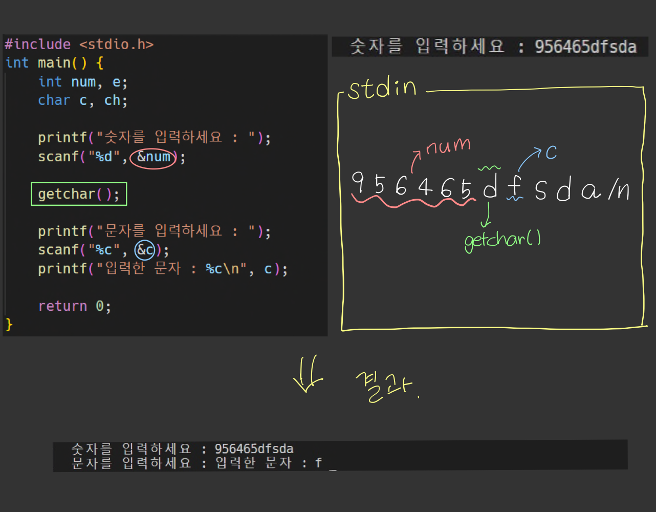 - %c๋ ๋ฑ ํ๋์ ๋ฌธ์๋ฐ์ดํฐ๋ง ๊ฐ์ ธ์ค๊ธฐ ๋๋ฌธ์ stdin์ \n์ด ๋จ์์์ผ๋ฉด ๊ทธ๊ฒ์ ๊ฐ์ ธ์ค๊ณ ์ข ๋ฃ๋จ.